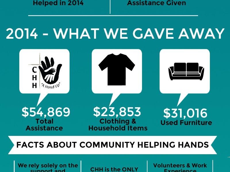 DetailsOur 2014 numbers are in! Community Helping Hands had the honor of assisting 1,737 people in 2014, which means we gave away $54,868.70 in furniture, clothing and household items to local families in need.