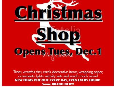 DetailsChristmas Shop opens Tuesday, December 1 at 10am, and you would NOT believe everything we have! Tins, Christmas Trees, wreaths, ornaments, decorative items, lights, stockings, outside decorations, glassware and MORE. New items put out every day and even every hour! Some of our brand new! Open Tuesday through Friday, 10-4 and Saturdays, 10-12 until December…