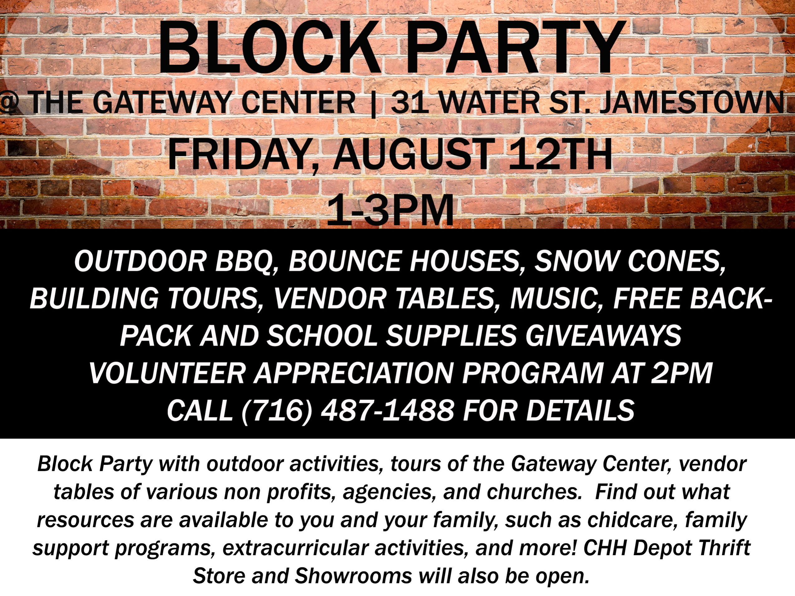Thank you to everyone who made our Block Party such a success on Friday, August 12! Staff and volunteers (you rocked)! The Chautauqua Center AJ s Texas Hots Stroehmans Bakery Conduit Ministries Bemus Point UMC Youth Group St Susans Center Zion Tabernacle Church Outta Sight Bounce House Rental Jamestown Fire Department Jamestown Police Department Mayor…
